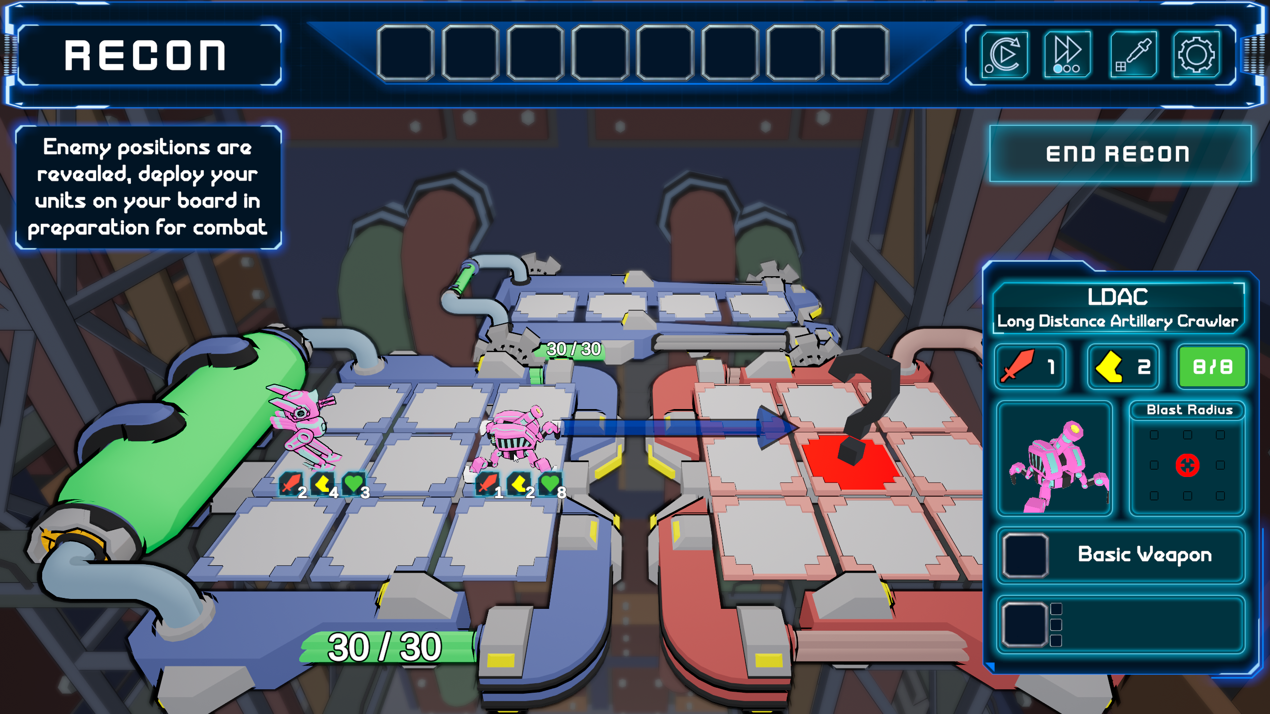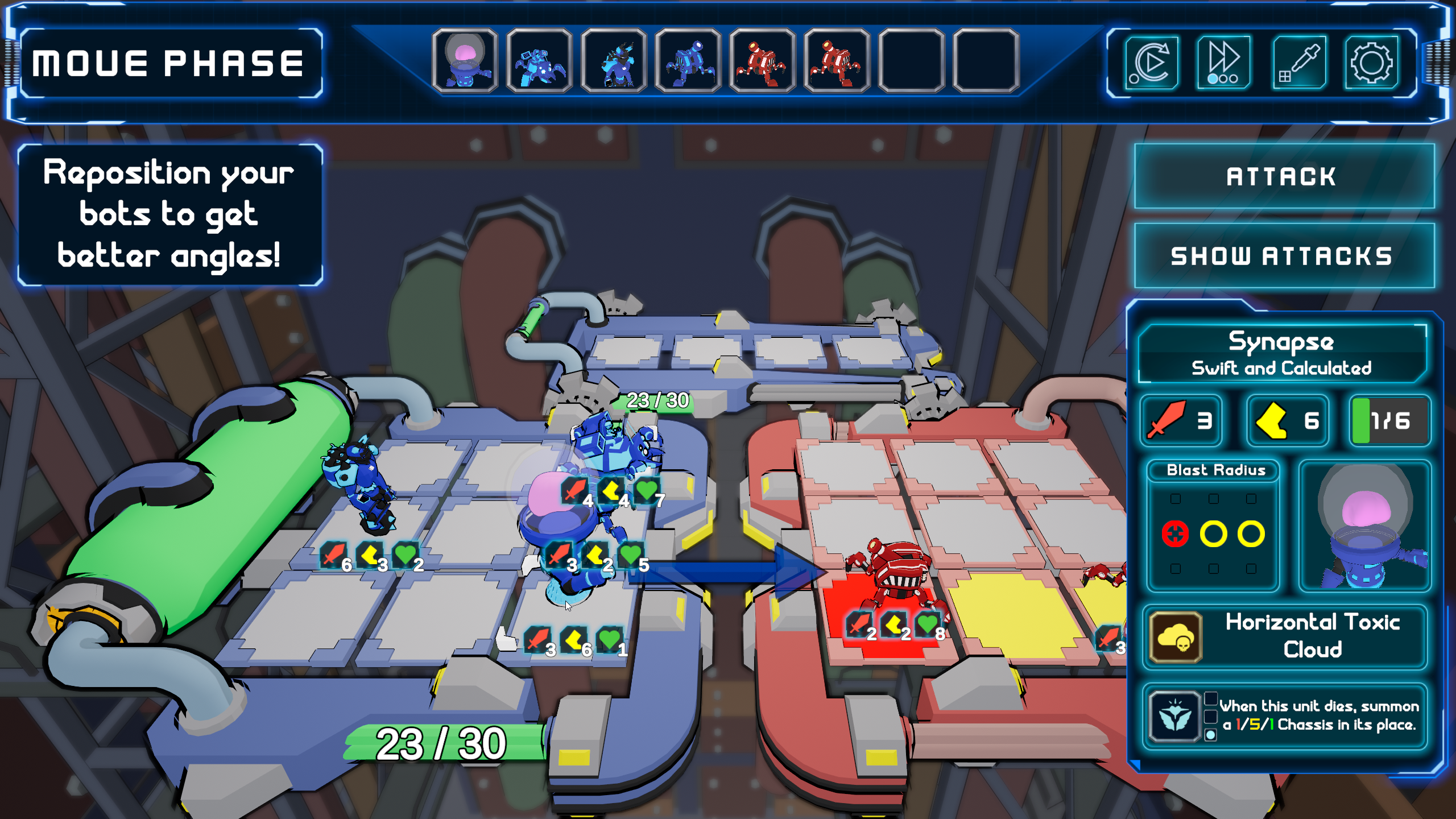As you can see from the screenshots, Factory Reset is quite a complicated game with lots of room for strategy and build planning. Because of the high level of complexity of it’s systems, we had to really hone in the player onboarding experience. Our biggest priority was displaying important information when the player needed it and balancing that with not overwhelming them. We developed a robust tooltip system for all the items in the game as well as made sure all available actions for the player were as responsive as possible. Eventually, with months of iteration and playtesting, new players started to ask less questions and were naturally taking on the intricate enemy encounters with ease. By the end of the project, we had an extremely juicey, responsive, and most importantly fun gameplay experience.